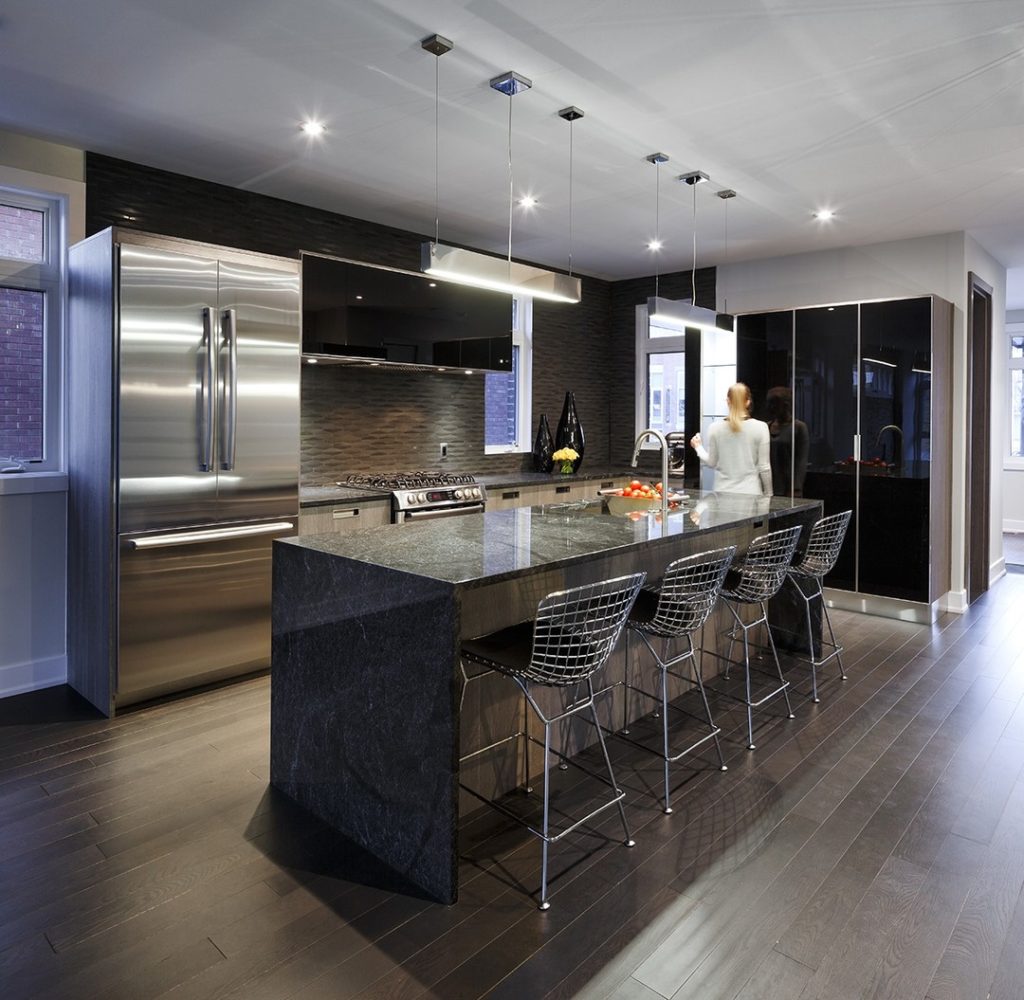 Кухня выполнена на базе мебели фабрики Lotocento - модель с эксклюзивной эстетикой, в которой все композиционные элементы кухни вдохновлены чистейшей геометрией и характеризуются простотой и строгостью. В ней реализованы лучшие отличительные черты кухонь фабрики: рисунок из тонких чистых линий, создающих уникальную по своей геометрии современную кухню. Впечатление воздушности и зрительное увеличение пространства вокруг кухни достигнуто за счет использования тонких модулей и отсутствия внешних ручек. Профиль ручек создан на внутренней стороне фасадов что делает их незаметными, но функциональными. Фасады: тисненый лак, глянцевый лак, массив американского ореха, сатинированная сталь. Оригинальный светильник над обеденным столом и заказной паркет делают этот интерьер особенно уютным.